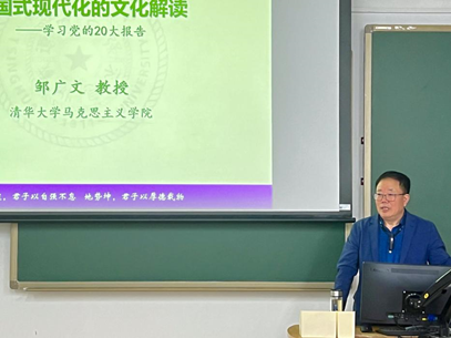 邹广文教授首先向同学们强调了学习贯彻党的二十大精神的重要性,勉励同学们认真学习党的二十大精神。随后,他以“中国式现代化的文化解读”为主题,通过对党的二十大有关论述的分析讲述,从文化认同、实践展开、未来展望三个文化解读的视角,对中国式现代化的发展逻辑、内容要义和价值指向进行了深入浅出的讲解和阐释。最后,他引用党的二十大报告,希望同学们“增强忧患意识,坚持底线思维,做到居安思危、未雨绸缪”,鼓励大家保持对中国现实发展道路的自信,把握中国道路的世界意义,坚持对中国未来发展前景的自信,为全面建设社会主义现代化国家的伟大事业贡献出自己的力量。