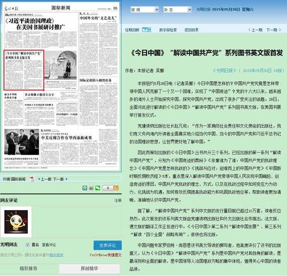 该丛书英文导读的撰写者、中国问题专家罗伯特·库恩高度评价了该书的出版意义,他认为《今日中国》“解读中国共产党”系列是中国共产党对其自身的解读,是最深刻和全面的解读,是中国领导人治国理政方略的集中体现,值得关心中国的读者品读。此前,罗伯特·库恩曾专门来中国,就该丛书的编撰情况采访编委会副主任、北航党委常务副书记张维维教授,该采访视频将于近期在中央电视台英文频道播出。近日,中央电视台新闻联播、人民日报、光明日报等媒体相继对该套丛书在美首发进行了报道。