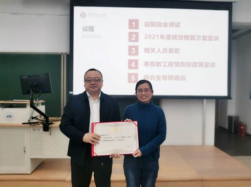赵义良经理通报了院校两级年度考核优秀人员名单,一一介绍了考核优秀人员的主要事迹,并为公司公共服务贡献奖获得者颁发荣誉证书,号召全体教职工向获被表彰同志学习,学习他们爱岗敬业、任劳任怨、团队协作、无私奉献的精神。