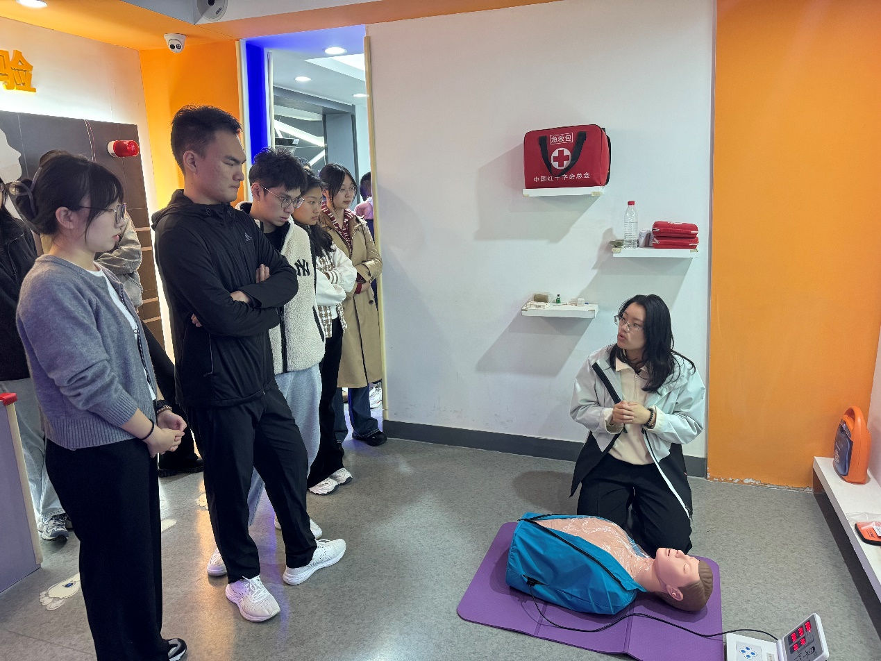体验馆相关工作人员首先向各位同学讲授了急救知识,主要包括突发急救情况的应急措施、胸外心脏按压的要点、AED除颤仪的使用方法等。其后,工作人员又向各位同学科普了“面对突发性火灾时如何自救”的相关知识,并带领同学们体验逃生通道和专业绳结的系法。在活动最后,同学们详细学习了救生衣的正确使用方法,并深入了解了救生衣各个部分的功能作用。