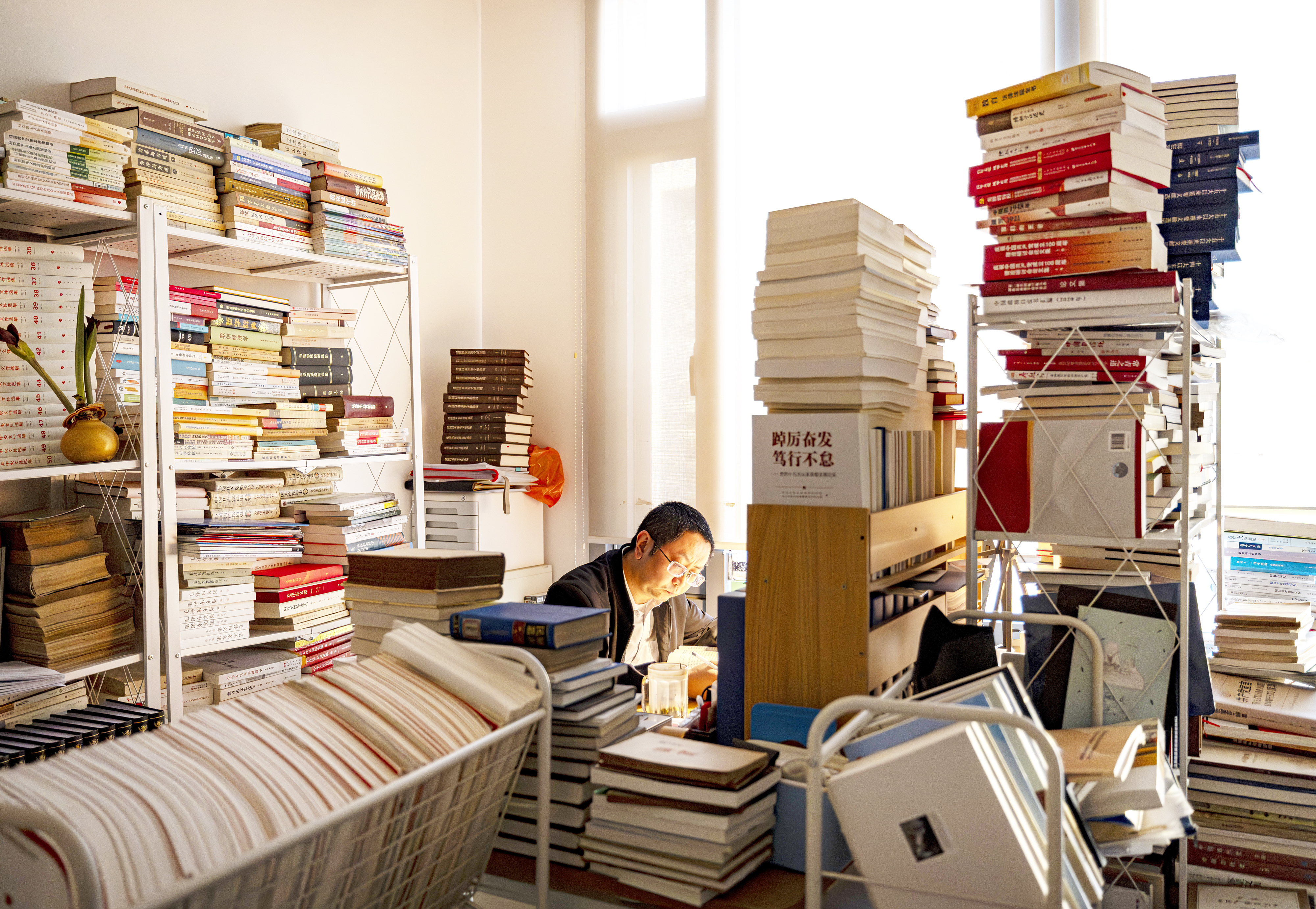 走进永利集团教授高宁的办公室,不由得屏息凝神——书桌上的书摞得高高的,连地上也堆着书;书架压弯变形,得用细铁丝缠绕加固。