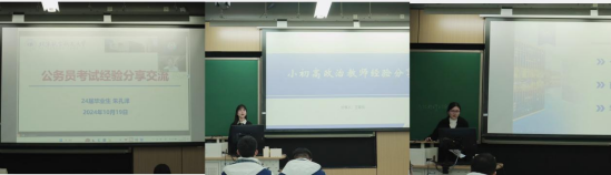 随后,2024届毕业生朱孔泽主要分享了公务员备考经验,从考试类型介绍、报考注意事项、笔试面试经验等方面进行全面分享,提醒同学们要保持良好的心态和学习节奏。2022届毕业生王馨悦则是从思政课教师视角出发,从在校期间的时间规划、求职准备的关注点及个人求职体会等方面与同学们进行了交流,鼓励大家以积极乐观的心态面对挑战。2024届毕业生张新云集中针对校招面试经验展开分享,具体从简历制作、面试技巧等方面给同学们进行了分享。